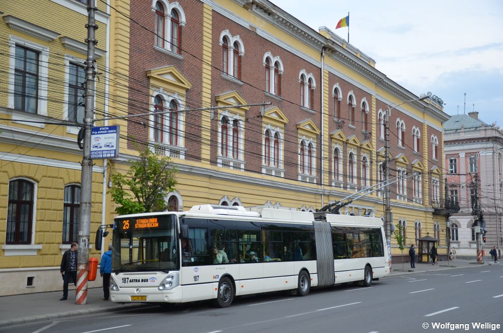 Im Jahre 2021 wurden alle Hochflurfahrzeuge in Cluj-Napoca durch Niederflurfahrzeuge des Typs Astra Imperio ersetzt. Am 7.9.2025 verlässt Wagen 91 gerade die Haltestelle Piața Gării Nord vor dem schön restaurierten Bahnhofsgebäude.