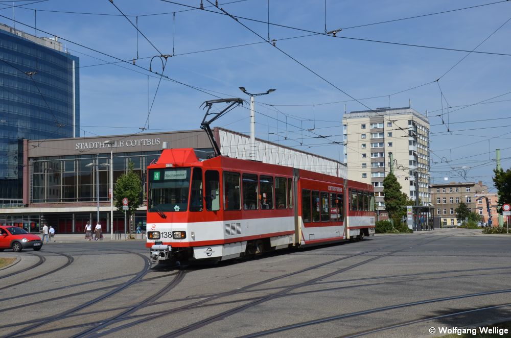 Der 1987 von CKD gebaute und 1997 um das mittlere Niederflurteil ergänzte Wagen 138 befährt am 18.08.2012 als Linie 4 die große Gleiskreuzung vor der Cottbusser Stadthalle