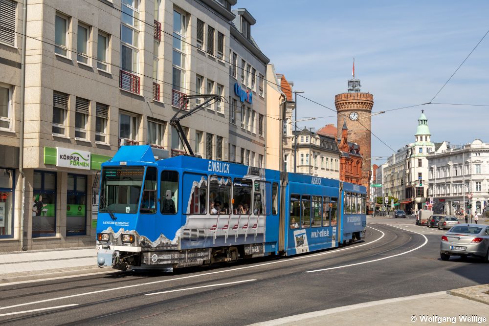 Wagen 135 fährt am 12. September 2023 auf die Haltestelle Marienstraße zu, im Hintergrund ist der Spremberger Turm zu sehen.