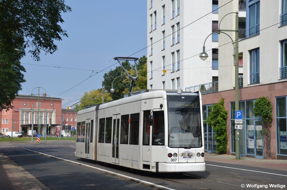 Zwischen den Haltestellen Hauptbahnhof und Theater entstand diese Aufnahme des im Jahr 2002 von Bombardier gebauten 'Flexity Classic' Nummer 307 am 08.09.2014 'ganz in Weiß' ohne Werbebeklebung