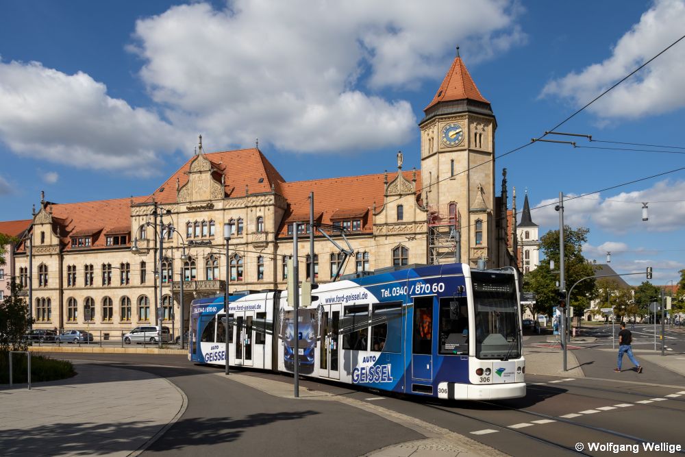 Vor dem repräsentativen Gebäude der Hauptpost erreicht Wagen 306 am 14.09.2023 gleich die Haltestelle Bauhausmuseum