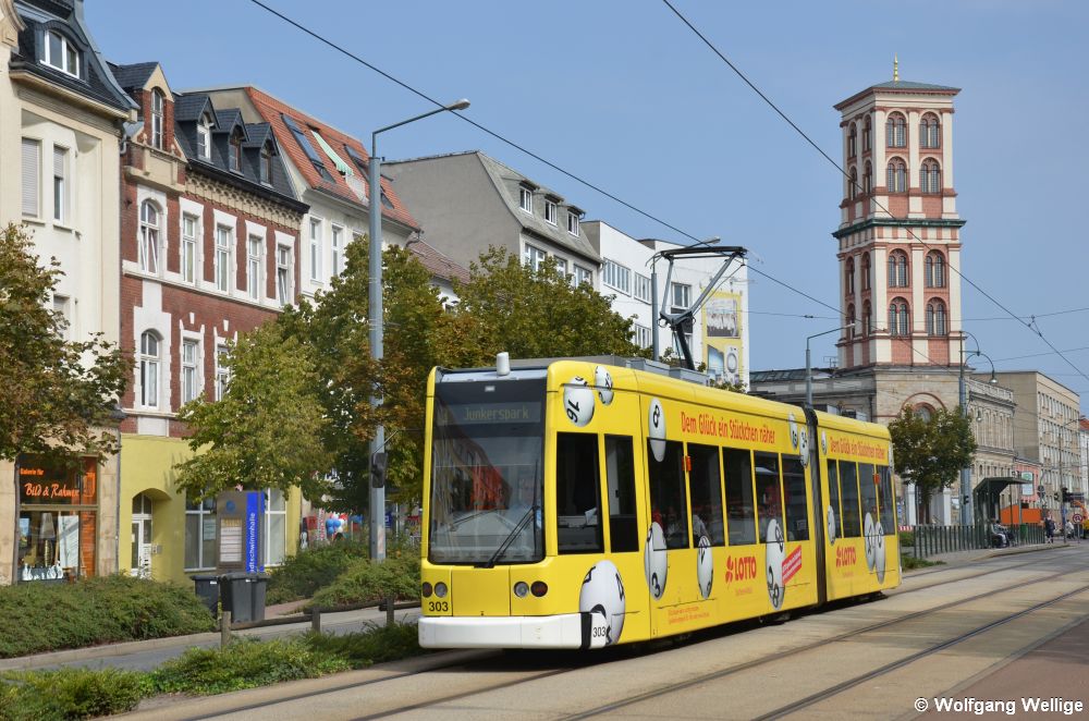 Der mit Lottokugeln 'verzierte' Bombardier Flexity Classic Nummer 303 ist am 8. September 2014 zwischen den Haltestellen Museum und Amalienstraße unterwegs als Linie 3 zum Junkerspark