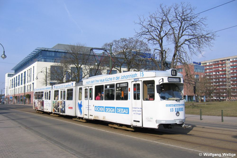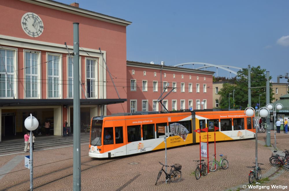 Dessau in Sachsen-Anhalt bildet seit 2007 mit Roßlau (Elbe) gemeinsam die Stadt Dessau-Roßlau, die zusammen auf ca. 80.000 Einwohner kommt. Das T-förmige Straßenbahnetz ist ca. 12 Kilometer lang und wird von der → Dessauer Verkehrsgesellschaft (DVG) betrieben.