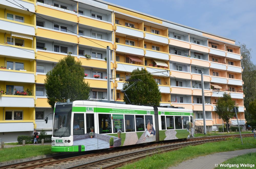 Zwischen modernisierten Plattenbauten fährt Wagen 305 auf der Linie 3 kurz hinter der Haltestelle Zoberberg Mitte Richtung Junkerspark (08.09.2014)
