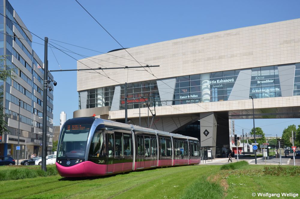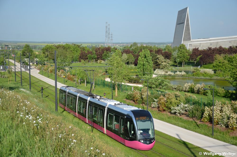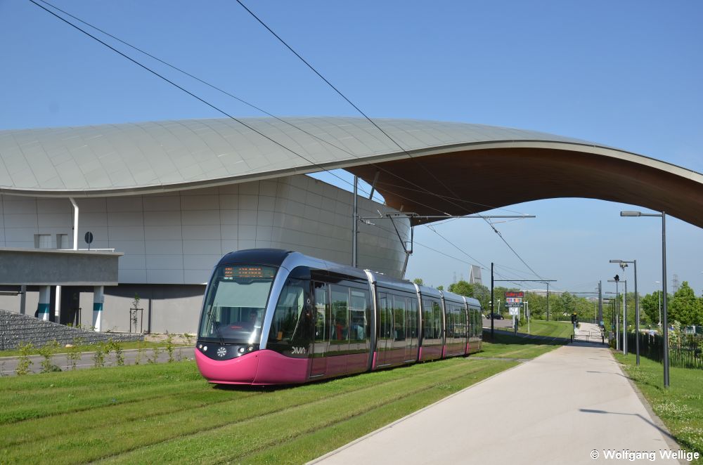 Citadis Nummer 1014 befährt am Abend des 13.05.2015 auf der Linie T2 die als Rasengleis angelegte Strecke durch einen Park hinter der Station Zénith, die nach der Veranstaltungshalle im Hintergrund benannt ist.
