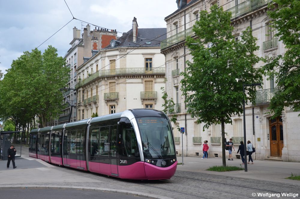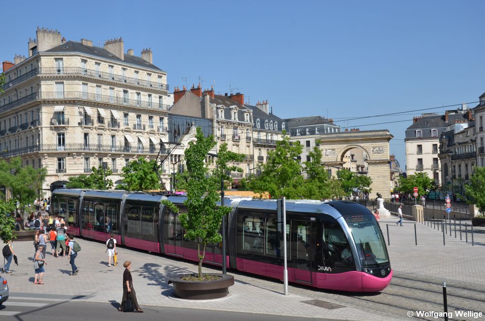 Nicht nur Paris hat seinen Triumphbogen, der von Dijon ist allerdings deutlich kleiner. Am 13.05.2015 fährt Wagen 1001 gerade aus der am Rande der Altstadt gelegenen Haltestelle Darcy aus.