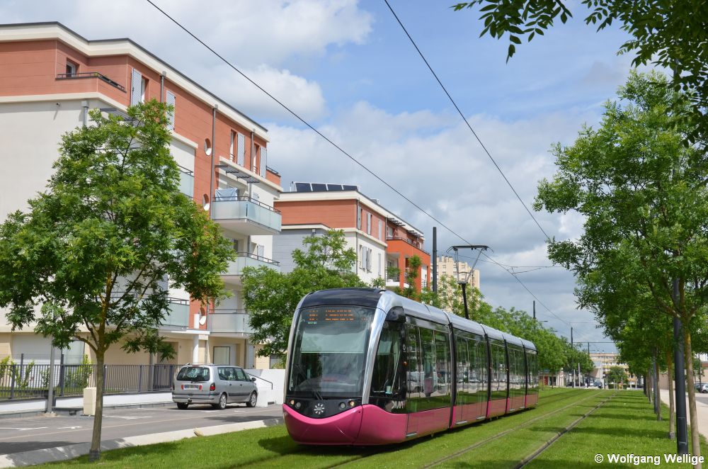 Durch ein noch recht neues Wohngebiet fährt Citadis 1017 hinter der Haltestelle Le Mail als Linie T2 auf die Endhaltestelle Chenôve Centre zu (14.05.2015)
