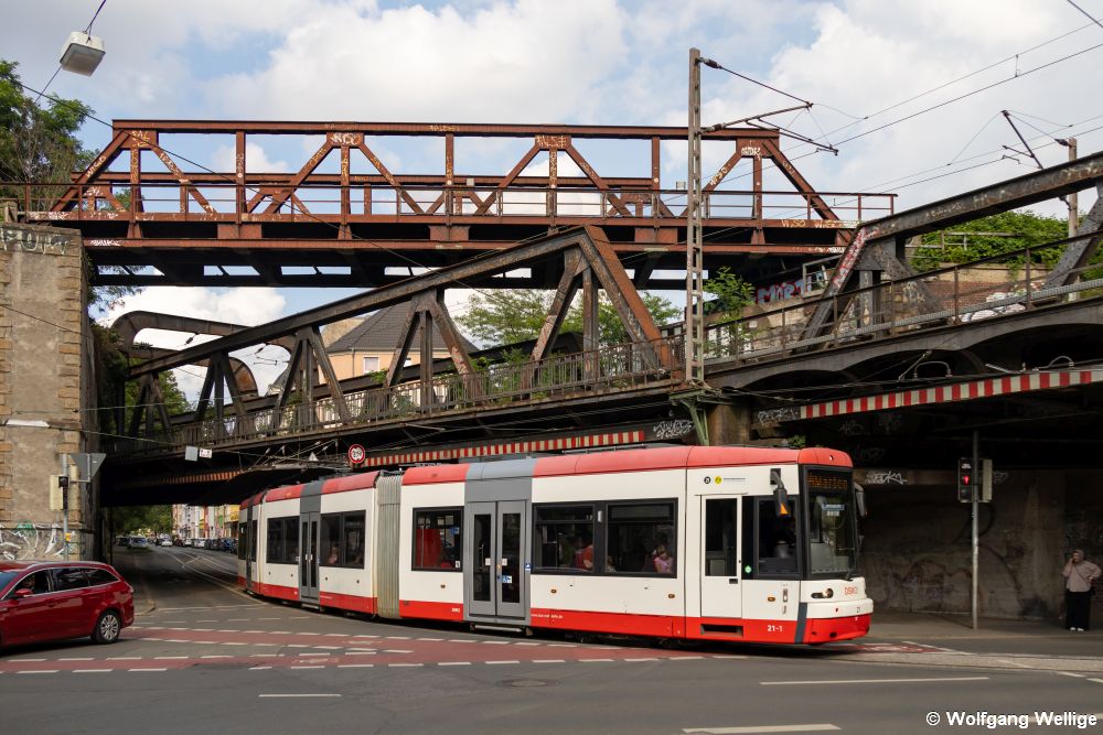 Wagen 21 unterquert am 17.07.2024 hinter der Haltestelle Enscheder Straße die beiden Eisenbahnbrücken der noch befahrenen Strecke nach Lünen (unten) und einer stillgelegten Güterzugstrecke (oben)