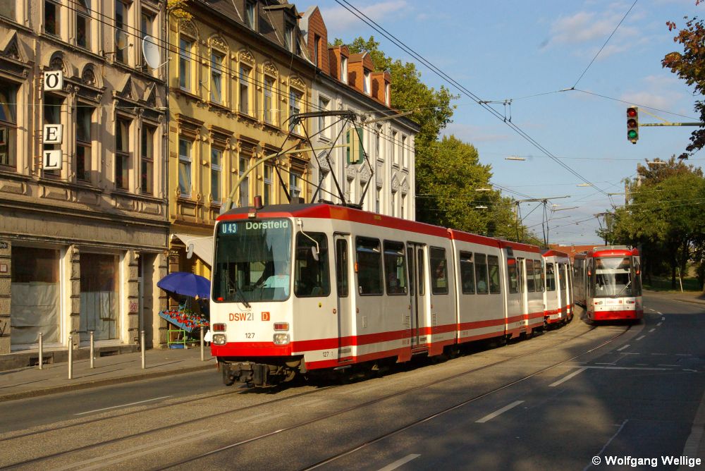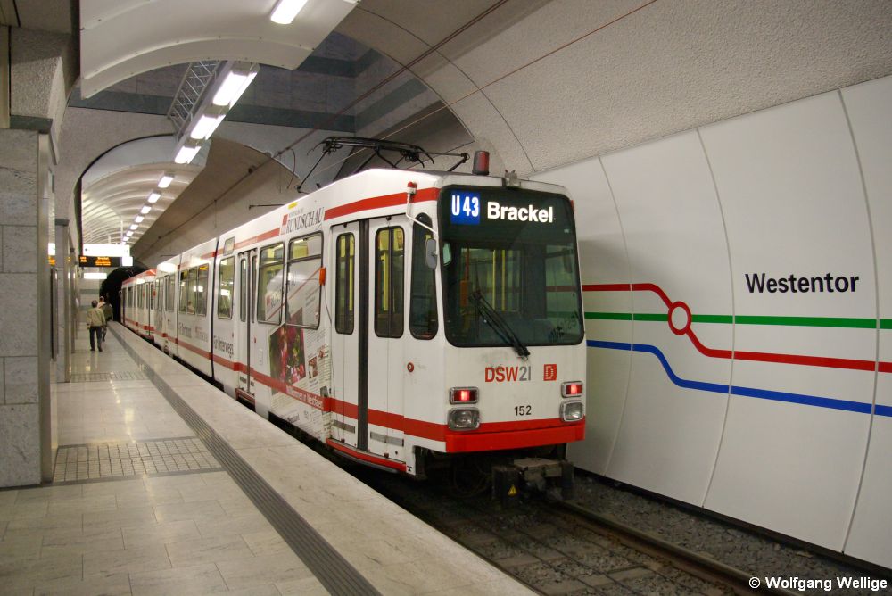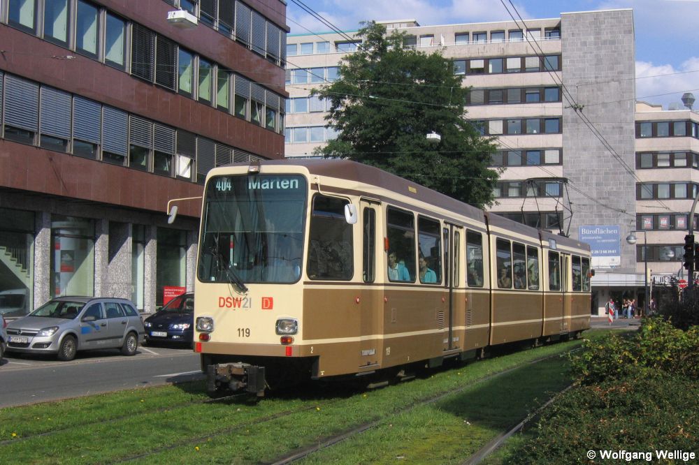 Im Jahre 2006 hießen die Linien U43 und U44 noch 403 und 404 und durchquerten die Innenstadt oberirdisch: Am 11.09.2006 ist der noch im alten Farbdesign lackierte Wagen 119 nahe der Haltestelle Kampstraße unterwegs Richtung Marten.