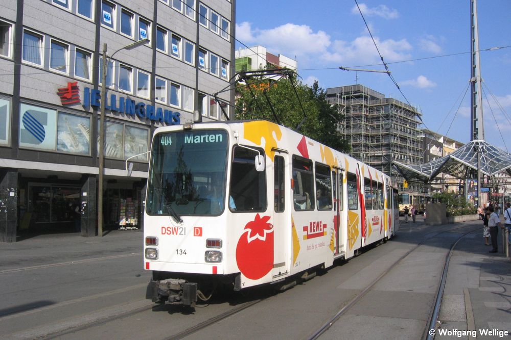 Der mit einer bunten Vollwerbung versehene N8C Nummer 134 hat am 11.09.2006 gerade die bis 2008 noch oberirdische Haltestelle Reinoldikirche verlassen