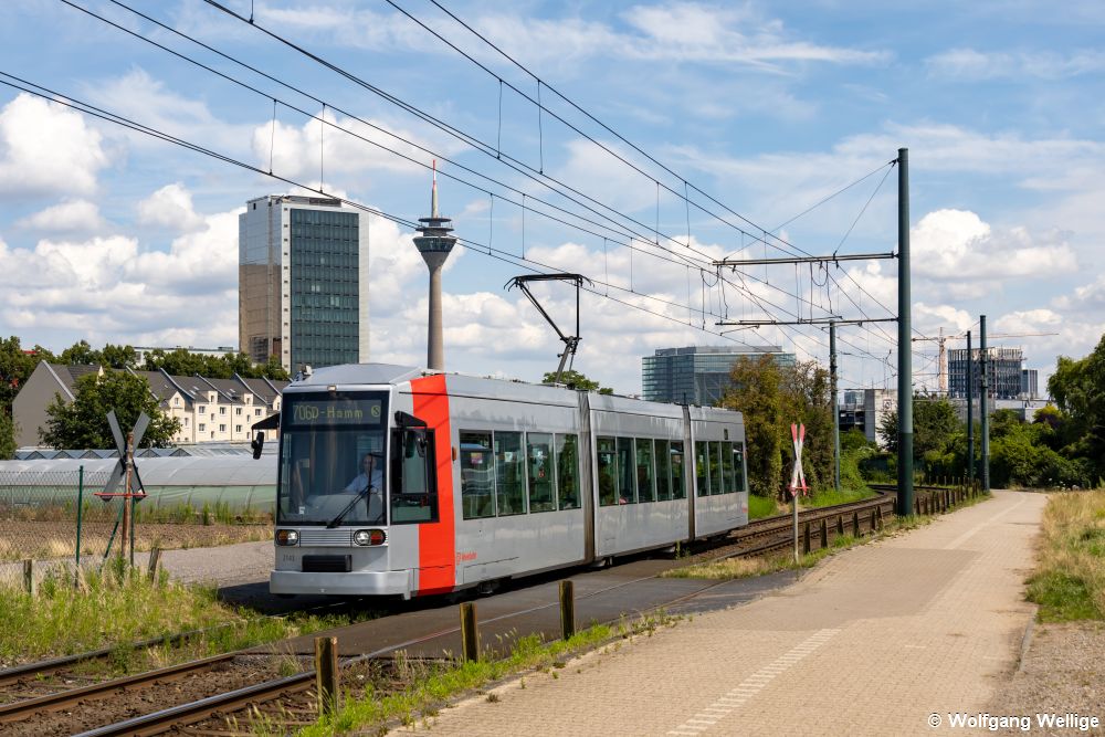 Vor der Kulisse des 240 Meter hohen Rheinturms zeigt sich Wagen 2143 am 18.07.2024 nahe der Haltestelle Hammer Dorfstraße