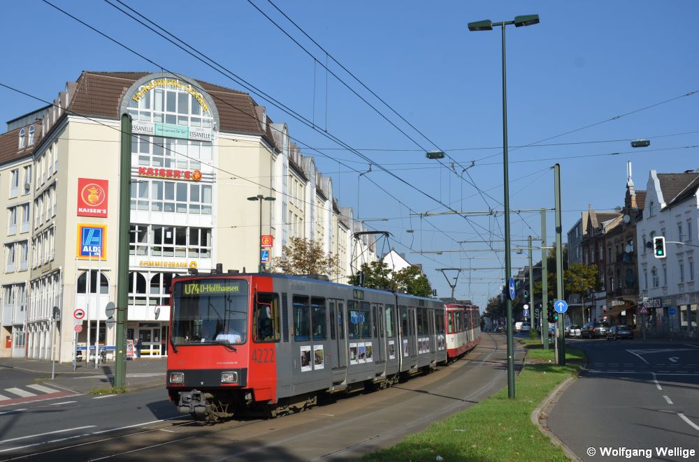 Der ins neue Rheinbahn-Farbschema umlackierte B-Wagen 4222 erreicht am 15. September 2013 als U74 gleich die Endhaltestelle Holthausen.