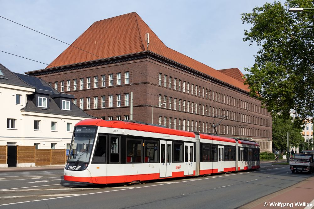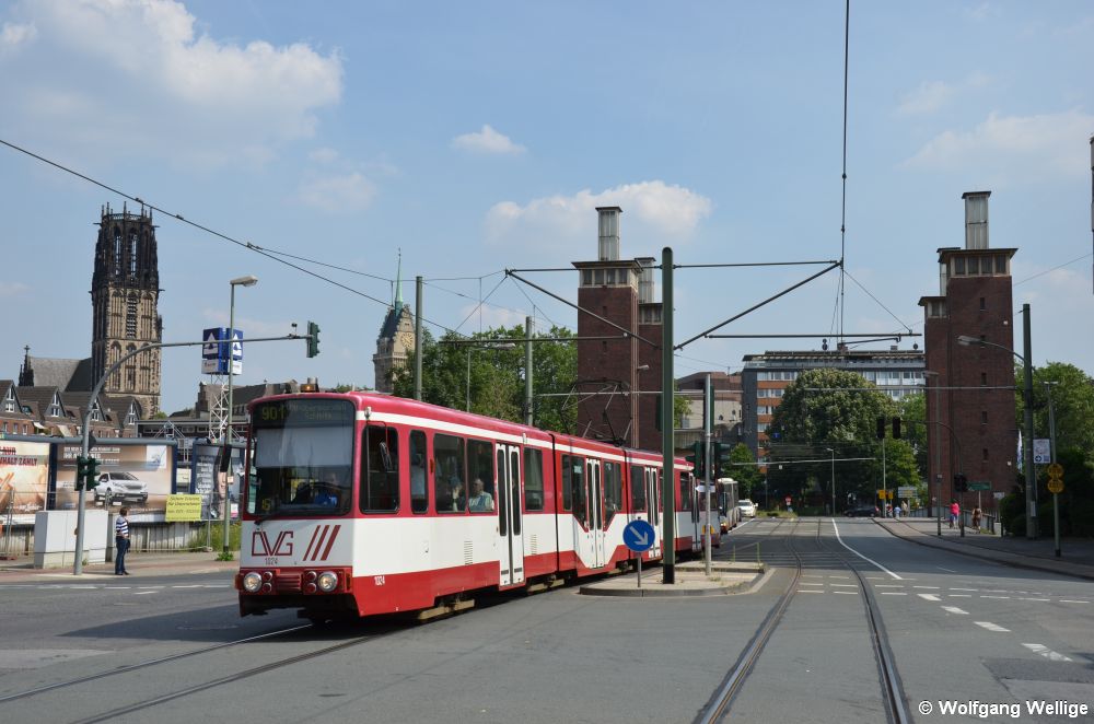 Wagen 1024 verfügt am 16.07.2013 noch über die ursprünglichen, runden Scheinwerfer. Auf dem Bild erreicht er als Linie 901 gleich die Haltestelle Scharnhorststraße, im Hintergrund sind die Türme der Schwanentorbrücke zu sehen.