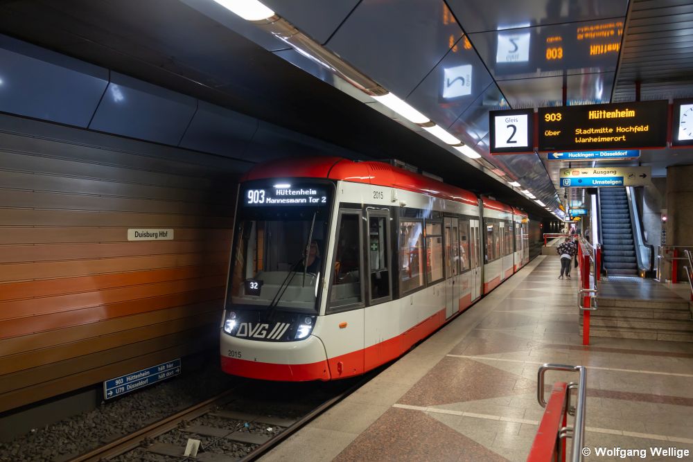 Der 'NF4' Nummer 2015 legt am 17. Juli 2024 einen Halt in der unterirdischen Station Duisburg Hauptbahnhof ein. Hinten ist der Hochbahnsteig für die Stadtbahnlinie U79 zu sehen, die auf demselben Gleis verkehrt.