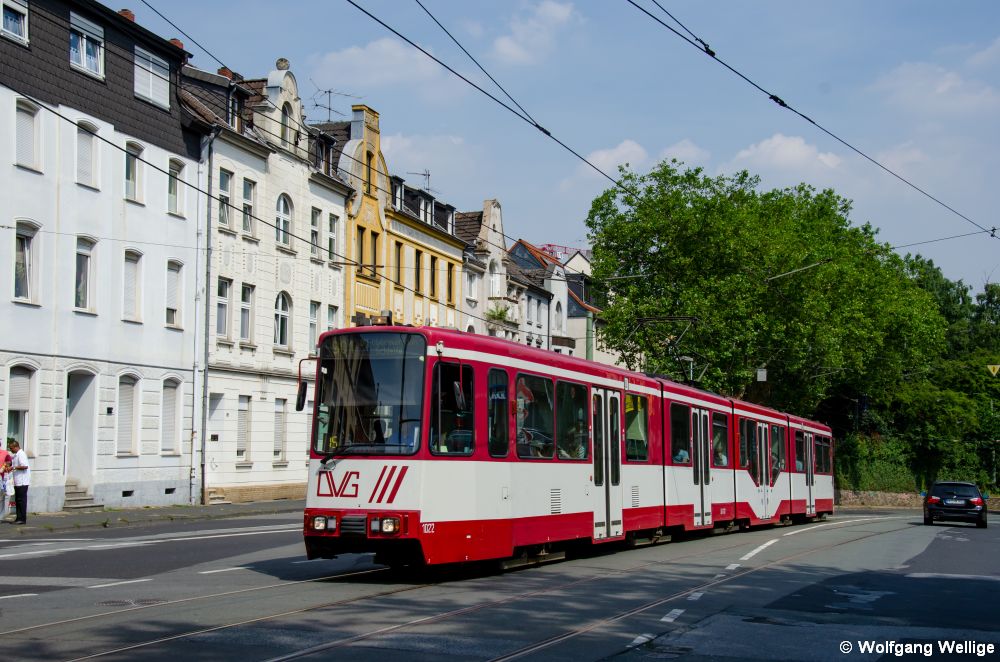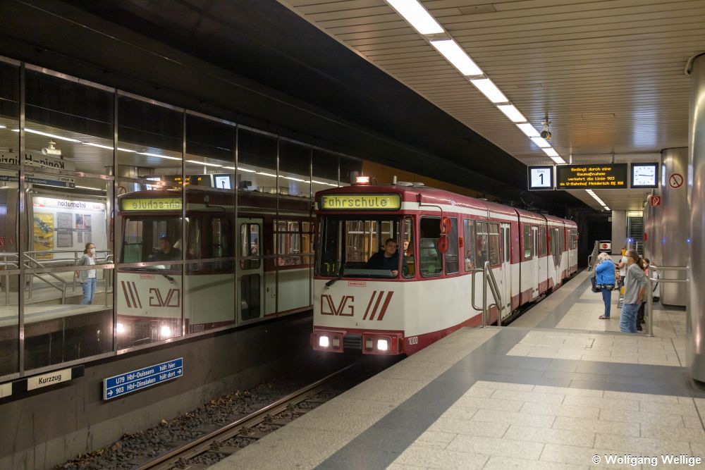 Der Fahrschulwagen 1000 ähnelt zwar optisch den Stadtbahnwagen GT10NC aus den 1980er-Jahren, wurde aber aus einem 'klassischen' Düwag-GT6 von 1966 umgebaut. Erkennbar ist dies z.B. an der kleineren Frontscheibe mit separater Zielanzeige, an den Türen mit deutlich kleineren Fenstern oder der in der Spiegelwand erkennbaren vorderen Einzeltür. Am 27.07.2022 legt das Fahrzeug auf einer Ausbildungsfahrt einen kurzen Stopp in der unterirdischen Station König-Heinrich-Platz ein.