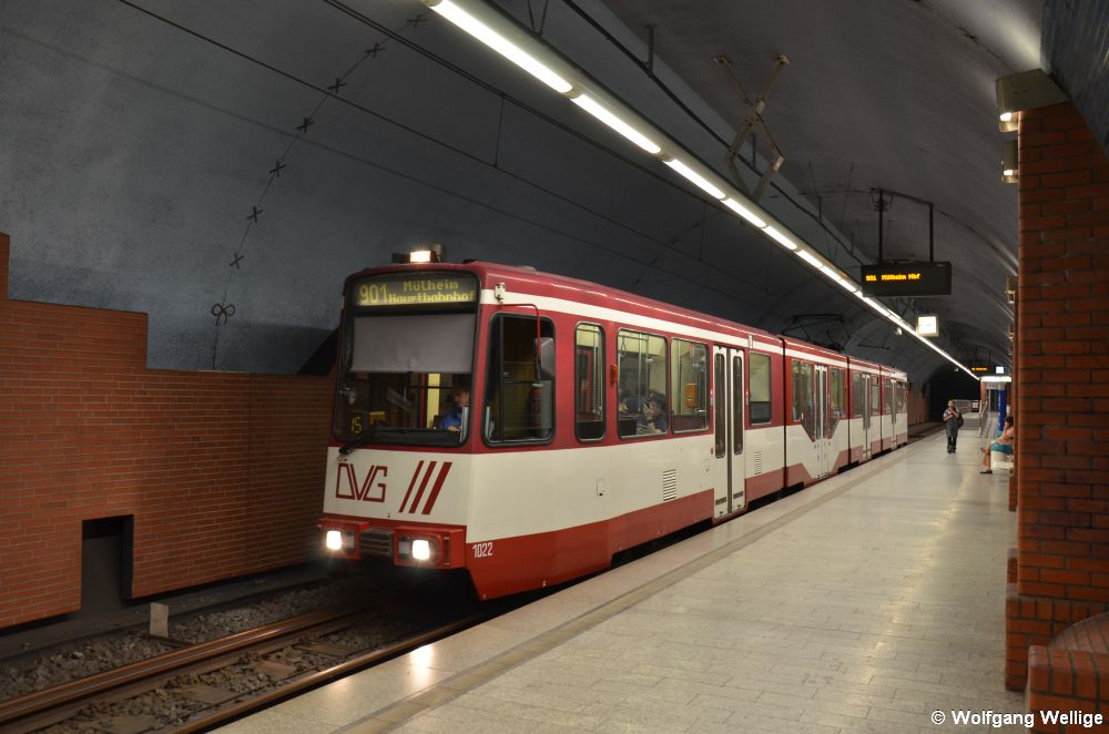 Der Ruhrtunnel in Mülheim wird auch von der Duisburger Linie 901 genutzt und hierfür zusätzlich zu den Meterspurgleisen der Mülheimer Straßenbahn auch mit Normalspurgleisen ausgestattet. Wagen 1022 hat 16.07.2013 beim Halt in Station Mülheim Stadtmitte gerade die Ruhr unterquert.