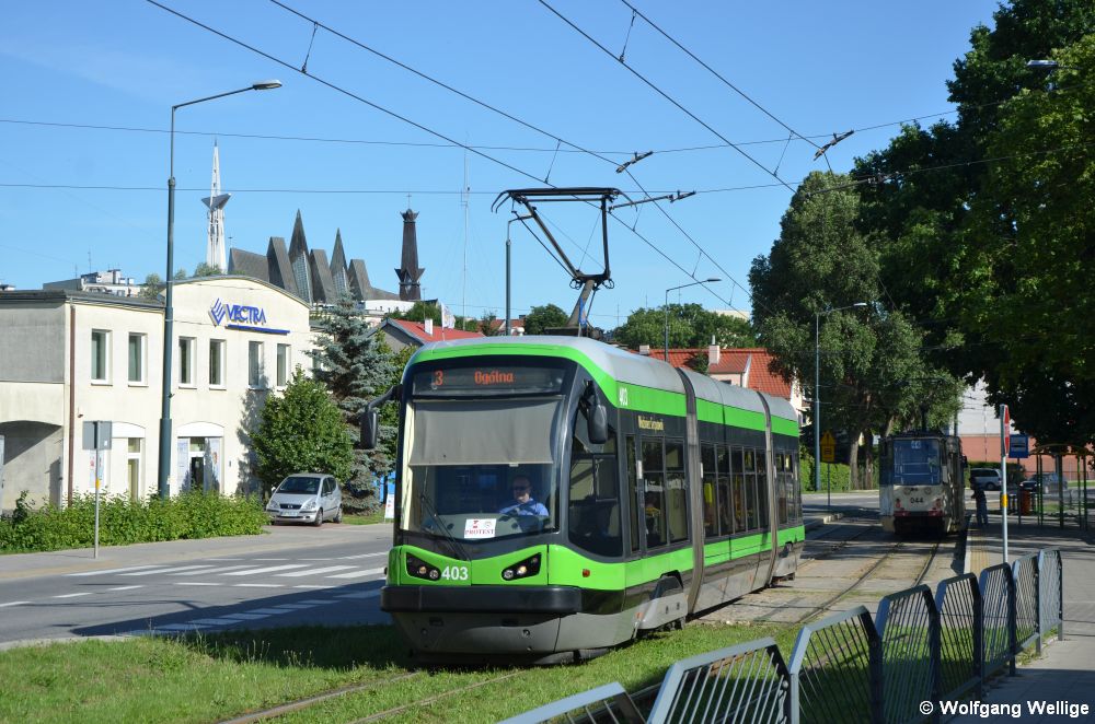 Der dreiteilige, im Jahre 2006 von PESA gebaute 'Tramicus' 121N Nummer 403 hat am 6. Juli 2017 gerade die Haltestelle Browarna (Urząd Gminy) verlassen.