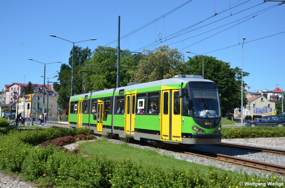 Wagen 810 ist der im Jahre 2015 gebraucht aus Augsburg übernommene, 1985 von MAN gebaute M8C Nummer 8010, der zuvor von Modertrans einen neuen Kopf und ein Niederflur-Mittelteil erhalten hat. Am 6. Juli 2017 durchfährt er gerade den Kreisverkehr nahe der Haltestelle Browarna (Zielone Tarasy).
