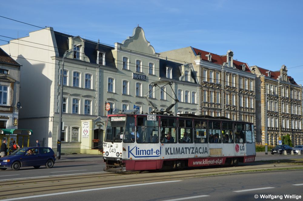 Der im Jahre 1984 von Konstal gebaute 805Na Nummer 043 ist am 6. Juli 2017 nahe der Haltestelle Dworzec (Bahnhof) als Baustellen-Sonderlinie 44 unterwegs Richtung Ogólna.