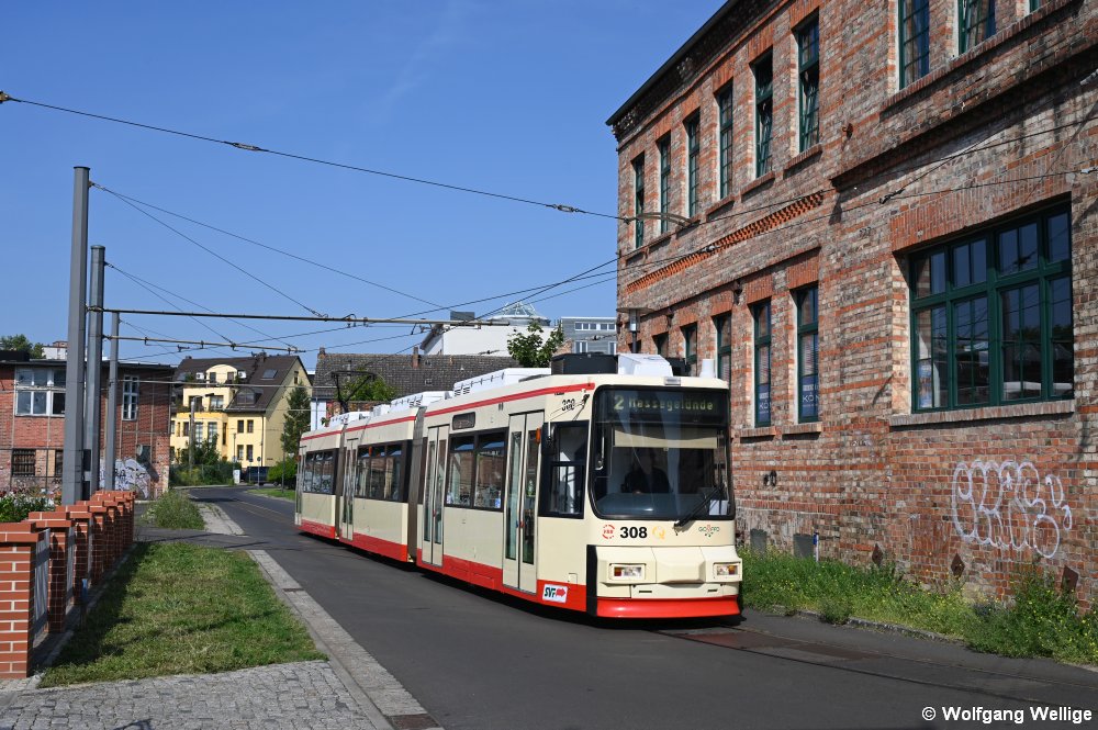 Der 1995 gebaute Niederflurwagen 308 befährt am 15. August 2025 die eingleisige Häuserblockschleife vor der Endhaltestelle Europa-Universität