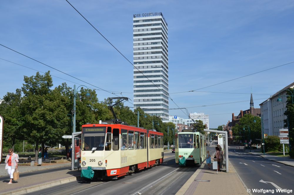 Wagen 205 fährt am 18. August 2012 in die Haltestelle Zentrum ein; im Hintergrund ist der knapp 90 Meter hohe Oderturm zu sehen, der das Stadtbild weithin sichtbar prägt.