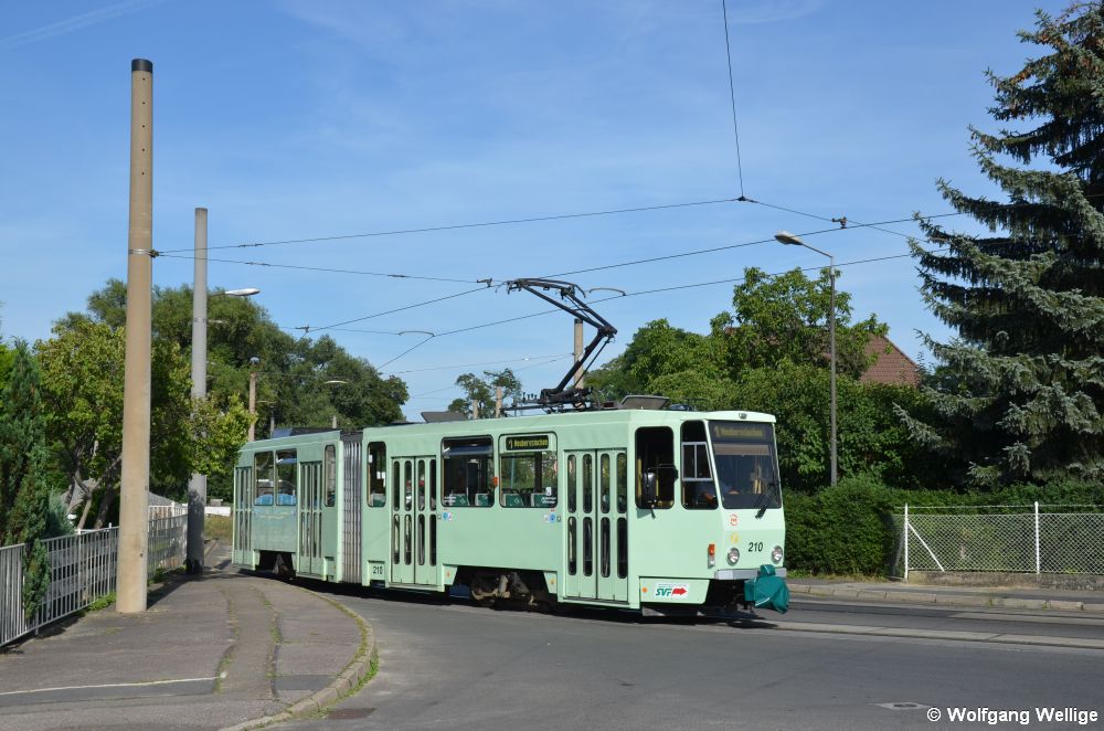 Wagen 210 trägt die neuere, einfarbige Lackierung der SVF. Hier verlässt er am 18.08.2012 auf der Linie 1 gerade die Wendeschleife Lebuser Vorstadt.
