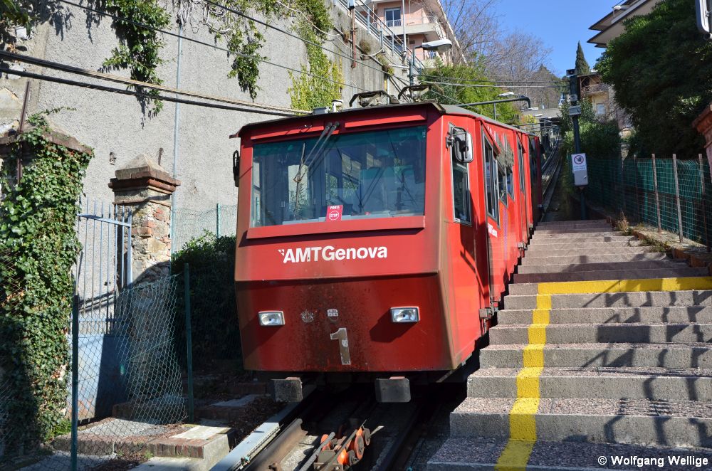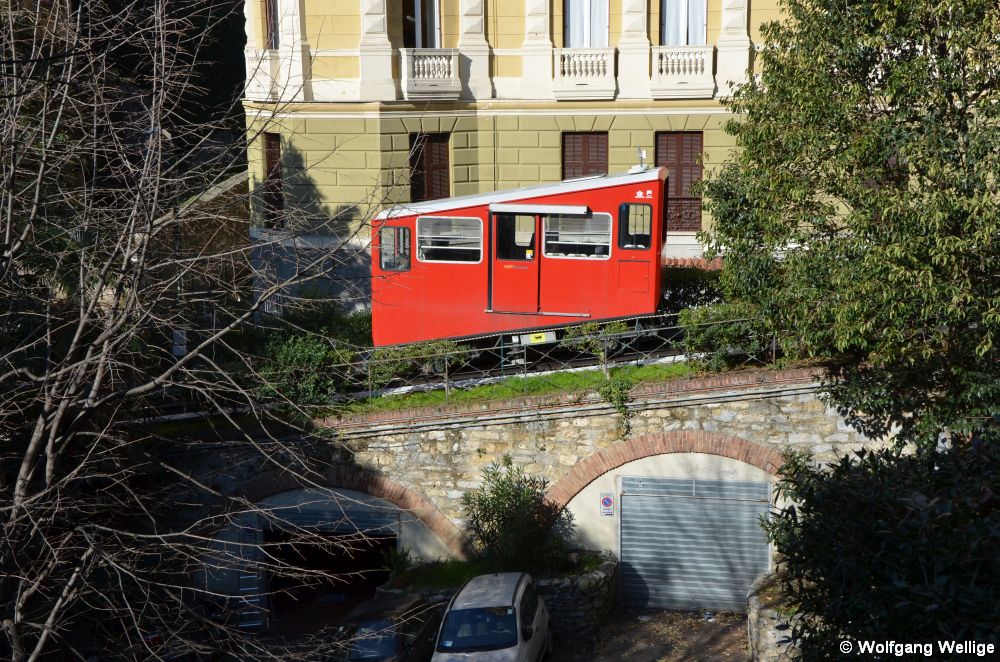 Vom Piazza Principe führt eine 1,1 Kilometer lange Zahnradbahn hinauf nach Granarolo, die aber leider nur alle 30 bis 60 Minuten verkehrt. Wagen 1 hat am 18. Februar 2017 gerade die Haltestelle San Rocco verlassen.