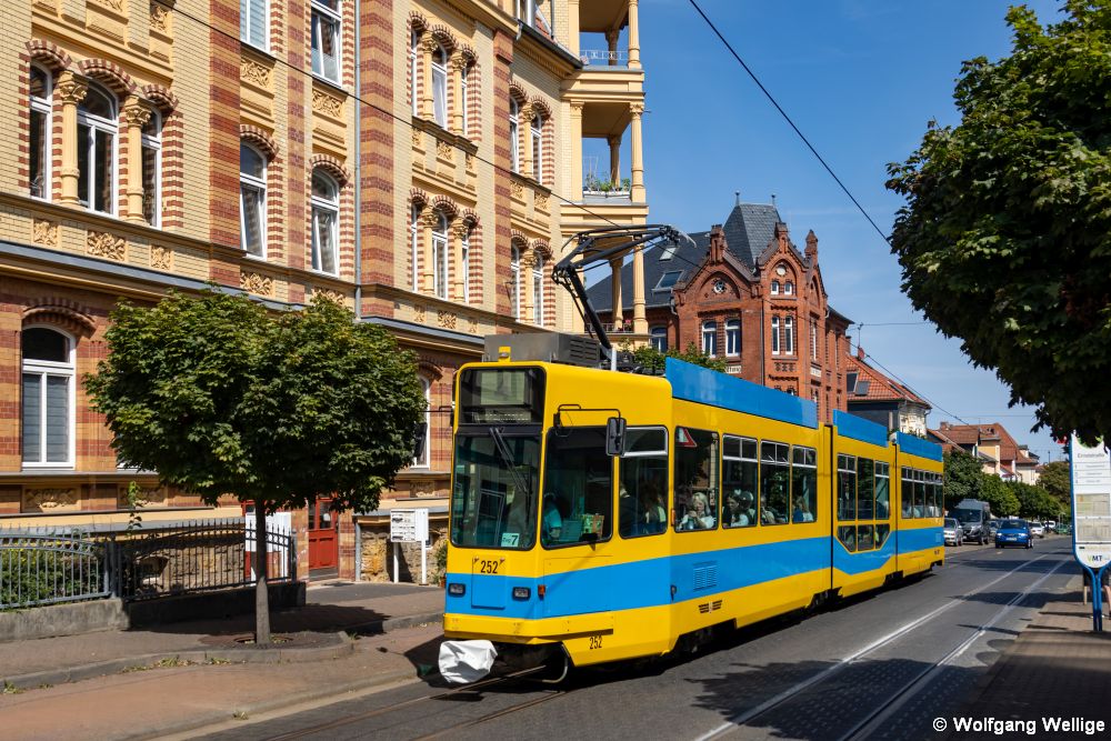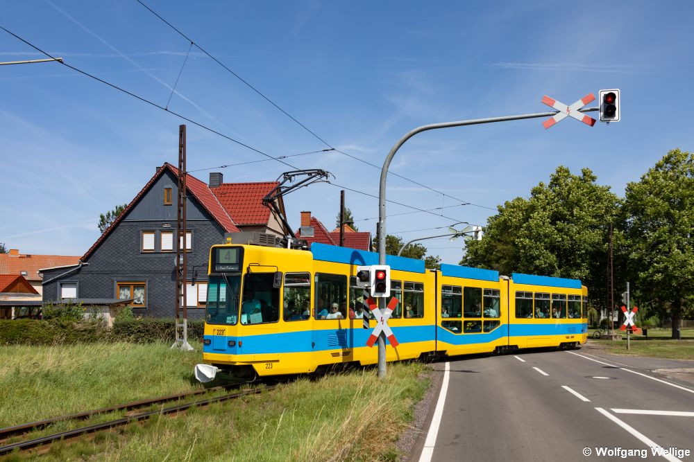 Seit Ende 2021 sind auf der Thüringerwaldbahn gebrauchte Wagen aus Basel im Einsatz, die 1987-81 von Schindler gebaut wurden. Am 22.08.2024 befährt Wagen 223 gerade den Bahnübergang in Wahlwinkel.