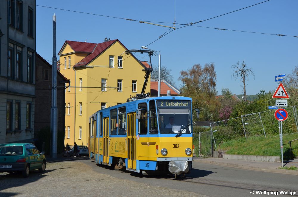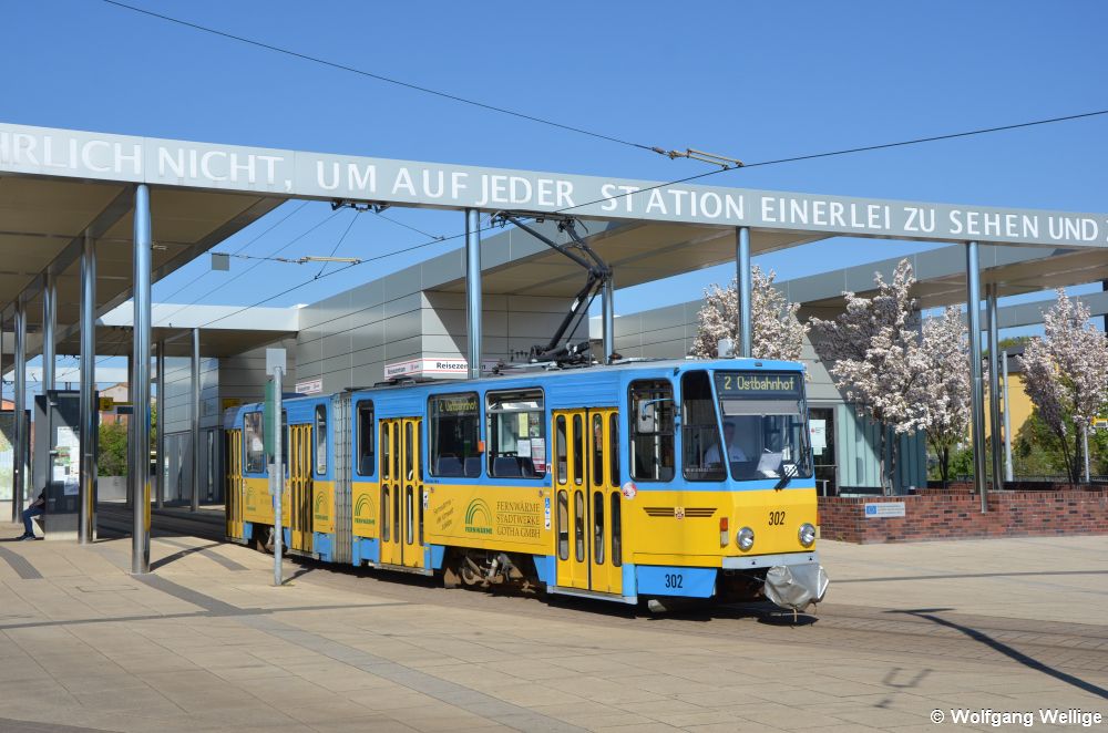 Der Tatra KT4D Nummer 302 verlässt am 7. Mai 2016 die großzügig angelegte Straßenbahnhaltestelle vor dem Gothaer Hauptbahnhof aus dem Jahr 2007. Das am Dach angeschriebene Zitat, welches auf dem Bild nur teilweise zu sehen ist, stammt von Johann Wolfgang von Goethe: 'Denn man reist doch wahrlich nicht, um auf jeder Station einerlei zu sehen und zu hören'