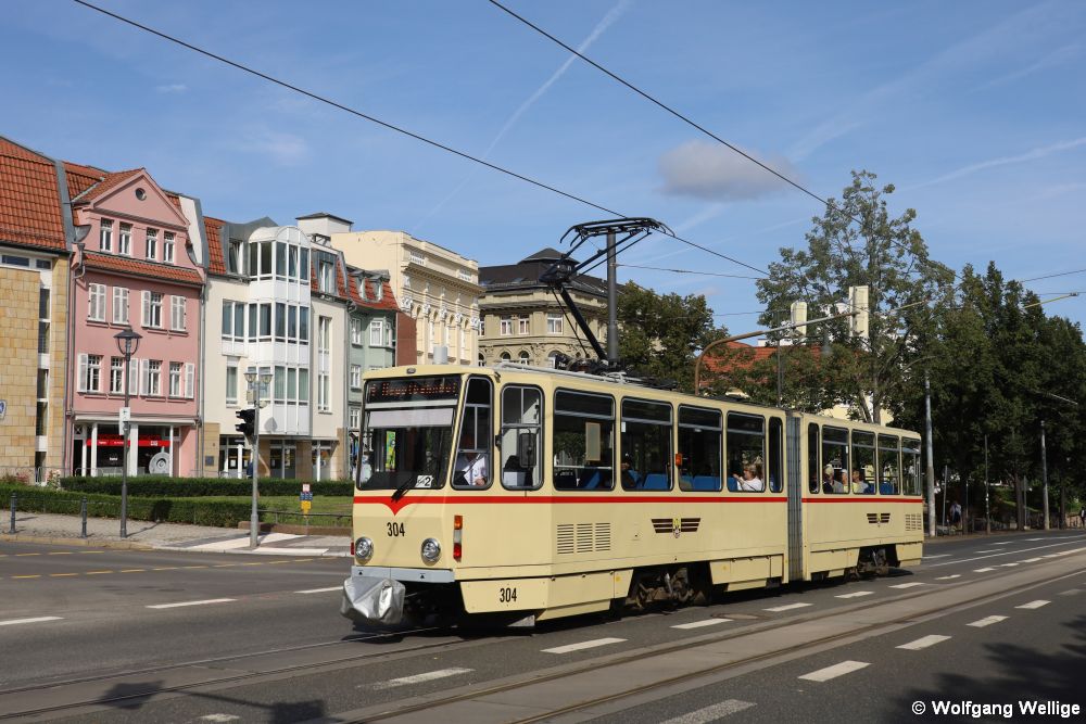 Der im Retro-Look elfenbeinfarben mit roter Binde lackierte KT4D Nummer 304 fährt am 22.08.2024 zwischen den Haltestellen Huttenstraße und Orangerie Richtung Hauptbahnhof