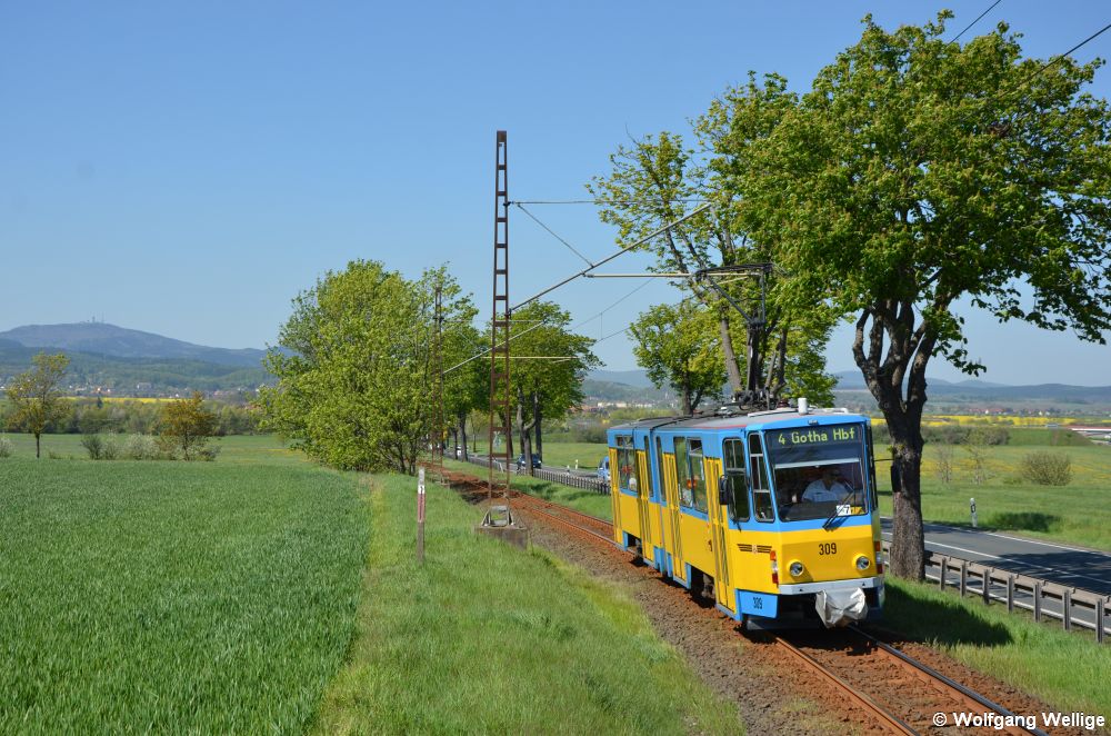 Zwischen Leina und dem Gleisdreieck Waltershausen verläuft die Thüringerwaldbahn größtenteils parallel zur Landstraße L1026. Bei Leina ist hier am 7. Mai 2016 Wagen 309 unterwegs nach Gotha. Links im Bild ist der Große Inselsberg zu sehen, der mit 916 Metern höchste Berg des nordwestlichen Thüringer Waldes.