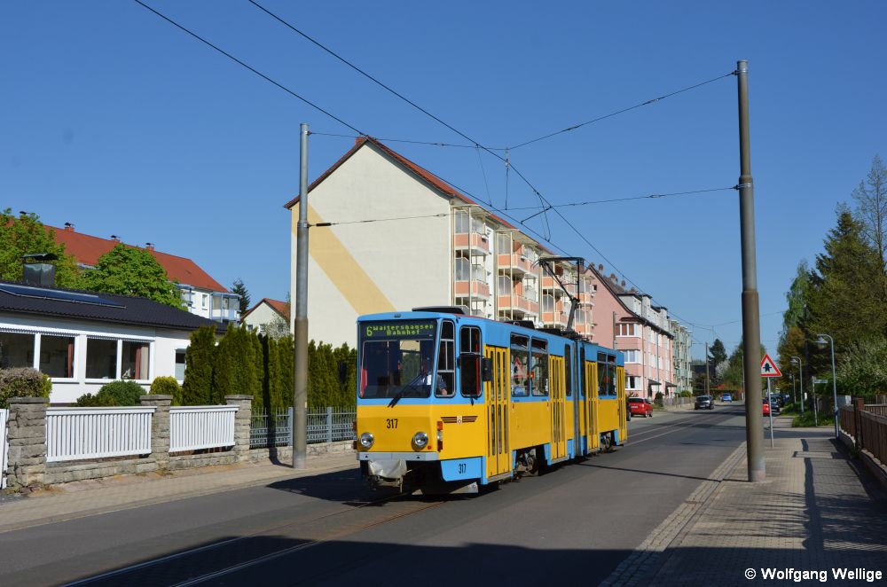 Die kurze Stichstrecke von Waltershausen Gleisdreieck zum Waltershäuser Bahnhof wird als Linie 6 bezeichnet. Hier ist am 07.05.2016 Wagen 317 im Einsatz, der für diesen Pendelverkehr zum so genannten Anderthalbrichtungswagen (oder auch 'unechter Zweirichtungswagen') umgebaut wurde. Das heißt, er erhielt zwar einen zweiten Fahrerstand, hat aber weiterhin Türen auf nur einer Seite.