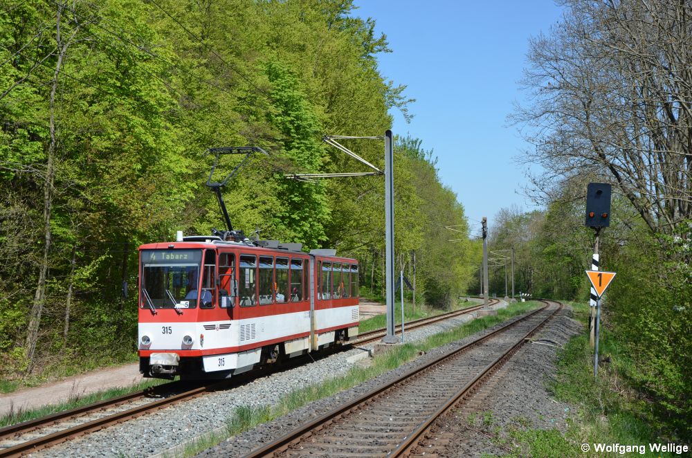 Zwischen Schnepfenthal und Reinhardsbrunn verläuft die Überlandstraßenbahn neben der DB-Strecke Fröttstädt - Friedrichroda. Am 7. Mai 2016 befährt Wagen 315, der noch im Erfurter Lackschema unterwegs ist, diesen Abschnitt. Das Überwachungssignal rechts an der Eisenbahnstrecke kündigt den gemeinsamen Bahnübergang in Schnepfenthal an.