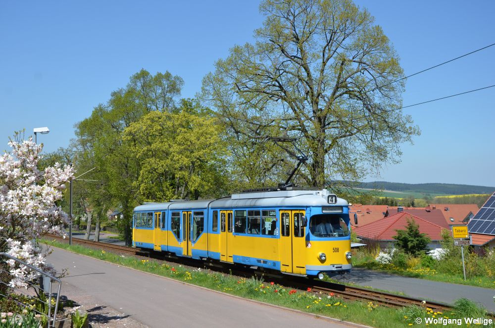 Der aus Mannheim übernommene, von Düwag gebaute und nachträglich mit einem Niederflur-Mittelteil ausgestattete GT8N Nummer 508 ist am 7. Mai 2016 gerade in Tabarz zur Rückfahrt nach Gotha aufgebrochen.