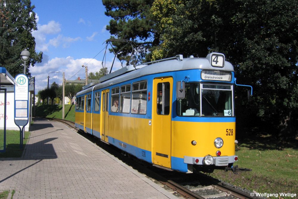 Bis 2007 waren die aus Bochum übernommenden Düwag-GT6 in Zweirichtungsausführung im Einsatz. Am 5.10.2006 wartet Wagen 528 seine Wendezeit in Waltershausen Bahnhof ab.