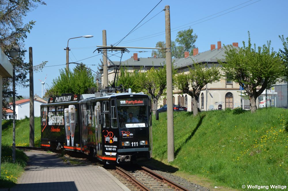 Die gebraucht aus Gera übernommene Partybahn Nummer 111 wendet am 7. Mai 2016 in der Wendeschleife Waltershausen Bahnhof, dessen Empfangsgebäude rechts im Bild zu sehen ist.