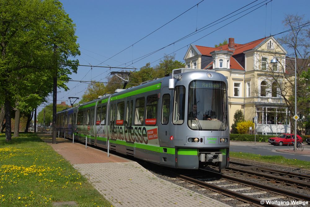 Wagen 2034 des von LHB und Siemens gebauten und vom britischen Designer Jasper Morrison entworfenen Typs 'TW 2000' fährt am 19. April 2009 nahe der Haltestelle Döhrener Turm als Linie 2 nach Rethen