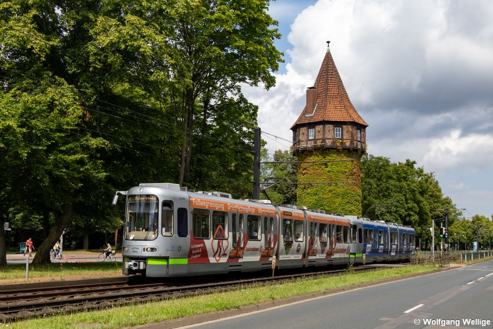 Wagen 2024 fährt am 16.07.2024 vor dem Döhrener Turm entlang, einem aus dem 14. Jahrhundert stammenden Wartturm der Landwehr, einer Grenzsicherung vor der eigentlichen Stadtbefestigung.