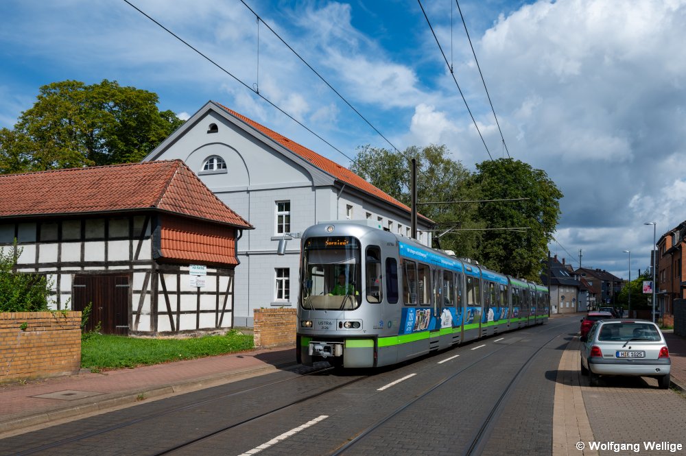 Auf der Überlandlinie 1 nach Sarstedt befindet sich die Ortsdurchfahrt Gleidingen, wo die Stadtbahn wie eine 'Dorfstraßenbahn' durch den Ort fährt. Die Aufnahme von Wagen 2525 entstand am 30.07.2025 hinter der Haltestelle Am Leinkamp.