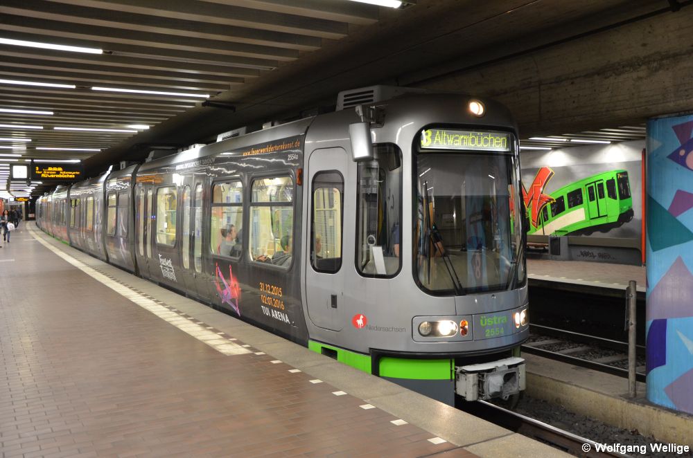 Der mit einer Ganzwerbebeklebung versehene Wagen 2554 hält am 14.09.2015 in der Tunnelhaltestelle Sedanstraße, deren (absichtliche) Graffiti rechts vom Zug seinen Vorgänger, einen Wagen vom Typ TW 6000 zeigen.