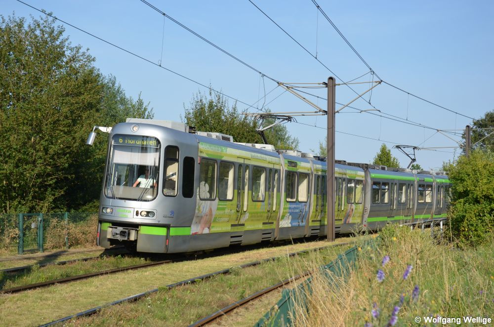 Wagen 2590 fährt am 19.07.2014 als Linie 6 Richtung Nordhafen zwischen den Haltestellen Feldbuschwende und Brabeckstraße durch die Heide. Die Fahrzeuge des Typs TW 2500 sind zwei fix gekuppelte Doppeltriebwagen mit Wagenübergang, so dass eine durchgängige, vierteilige Einheit entsteht.