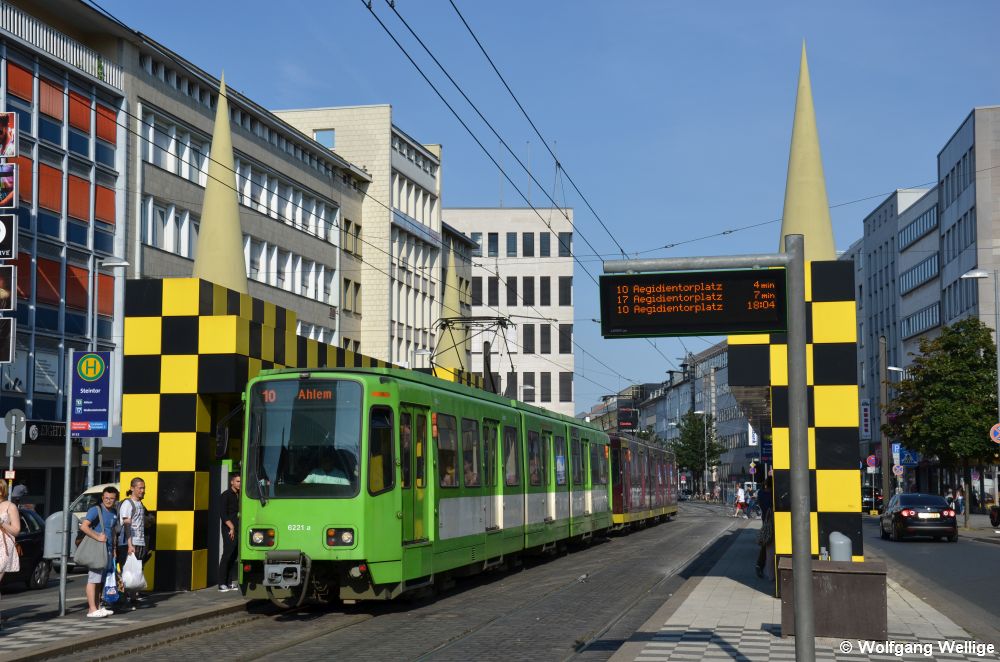 Triebwagen 6221 vom Typ 'Tw 6000' fährt als Linie 10 in die im Rahmen eines Kunstprojektes gestaltete Haltestelle Steintor ein, 19.07.2014
