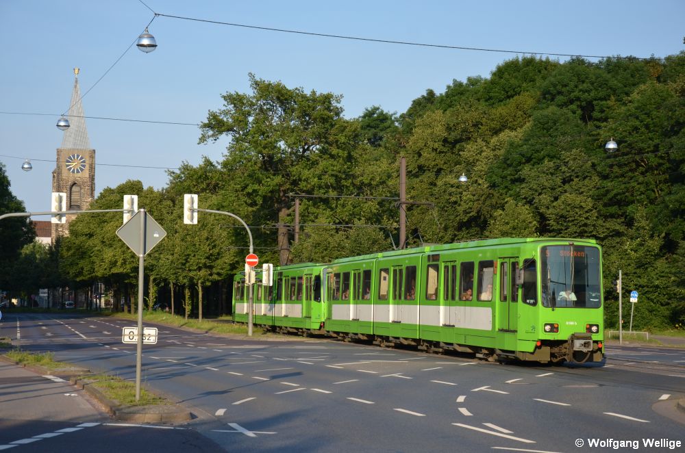 Wagen 6199 ist am 19. Juli 2014 zwischen den Haltestellen Kantplatz und Clausewitzstraße als Linie 5 nach Stöcken unterwegs. Im Hintergrund ist die Petrikirche im Stadtteil Kleefeld zu sehen.