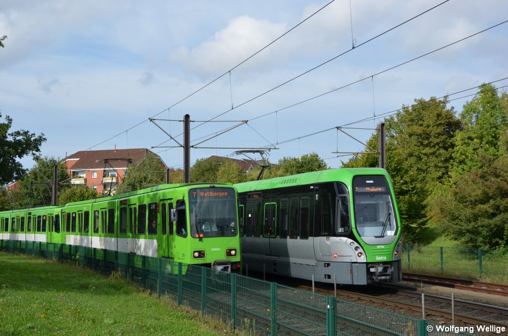 Der TW 3000 Nummer 3019 begegnet am 14.09.2015 als Linie 7 zwischen den Haltestellen Wettbergen und Tresckowstraße einem etwa 30 Jahre älteren TW 6000
