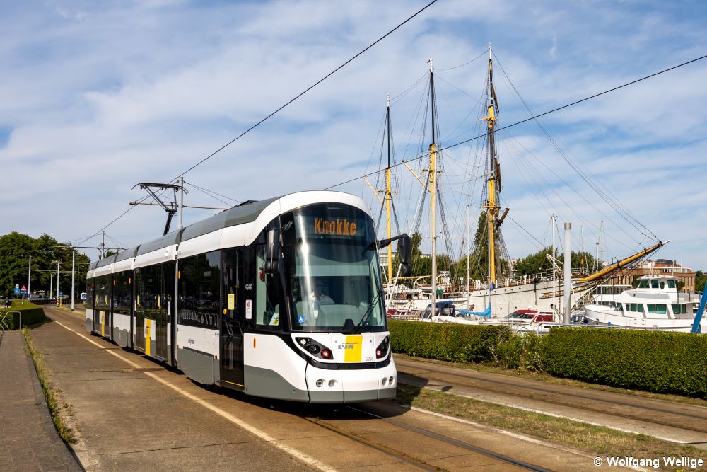 Vor der Haltestelle Oostende Station fährt die Kusttram direkt am Hafen entlang. Am 21.06.2022 zeigt sich hier Wagen 6156 vor einem alten Segelschiff.