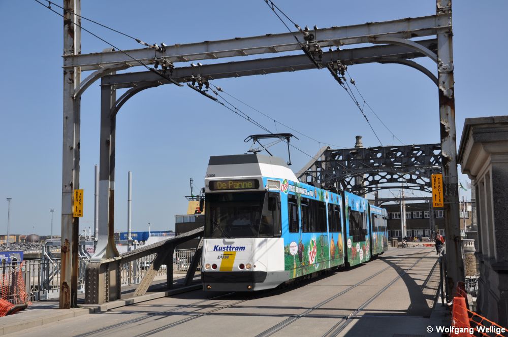 Wagen 7267, ein Fahrzeug des ab 1999 von De Lijn beschafften Typ 'HermeLijn' von Siemens und Bombardier, kommt am 1.6.2011 in Zeebrugge Zeesluis von der Umleitungsstrecke. Diese wird nur bei geöffneter Klappbrücke befahren, da das Abwarten der Öffnungszeit den Betrieb zu sehr verzögern würde. Der linke Brückenteil senkt sich aber bereits wieder.