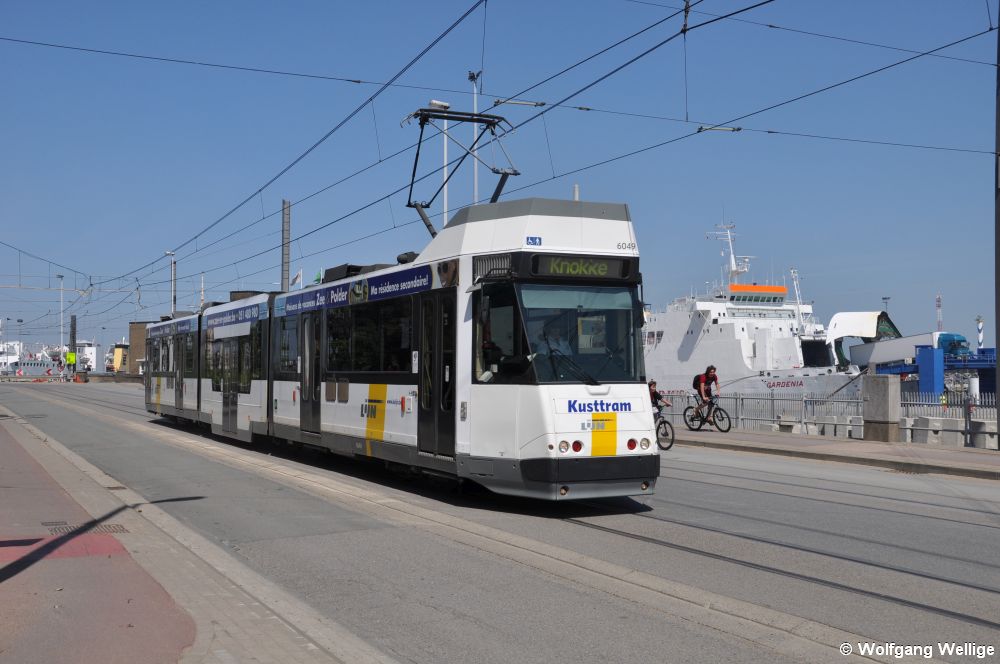 Mit dem Hafen von Ostende im Hintergrund fährt Wagen 6049 zwischen den Haltestellen Oostende Station und Weg naar Vismijn Richtung Knokke (01.06.2011)