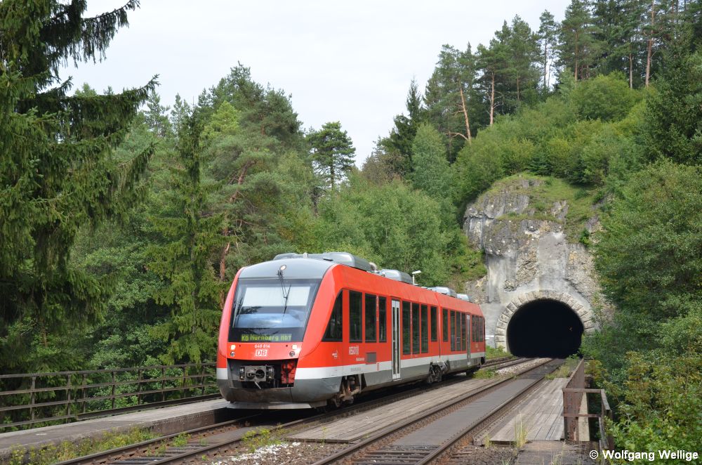 Triebwagen 648 314 des Typs LINT 41 hat am 21. August 2011 auf der Fahrt als RB 58524 von Neuhaus (Pegnitz) nach Nürnberg Hbf gerade den 170 Meter langen Haidenhübel-Tunnel kurz vor dem Haltepunkt Velden (bei Hersbruck) verlassen