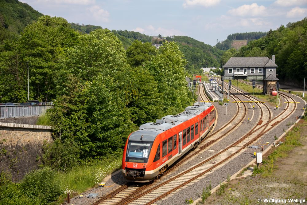 648 106 verlässt am 11. Juni 2021 den Bahnhof Lüdenscheid-Brügge mit seinem bekannten Reiterstellwerk als RB 52 Richtung Lüdenscheid