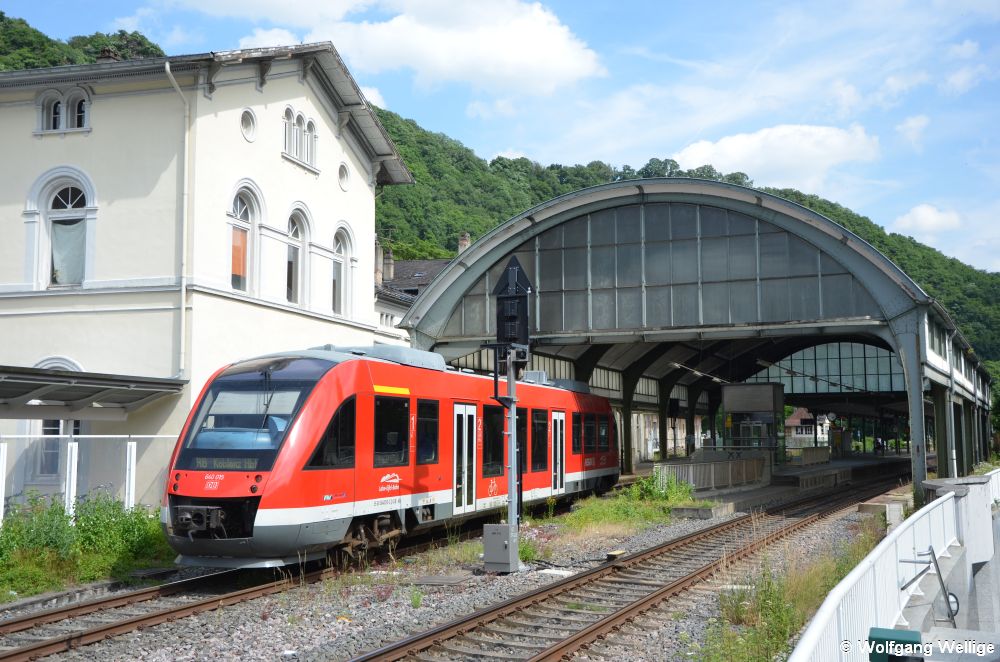 Der einteilige 'LINT 27' Nummer 640 015 verlässt am 23. Juni 2017 den Bahnhof Bad Ems mit der kleinsten Bahnhofshalle Deutschlands als RB 12698 nach Koblenz